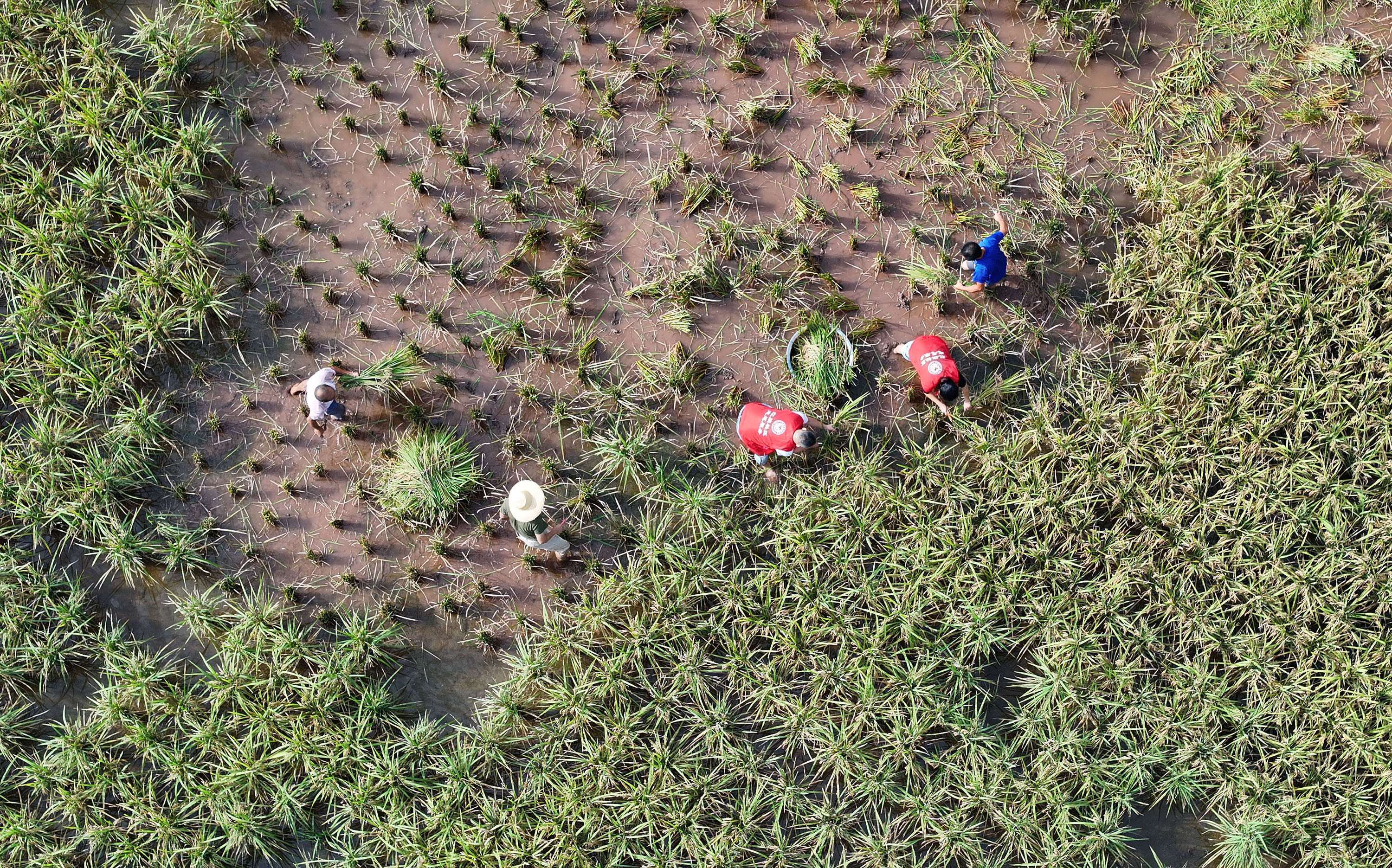 8月11日,内江市东兴区新江街道红旗社区,志愿者挥汗抢收水稻(无人机照片)