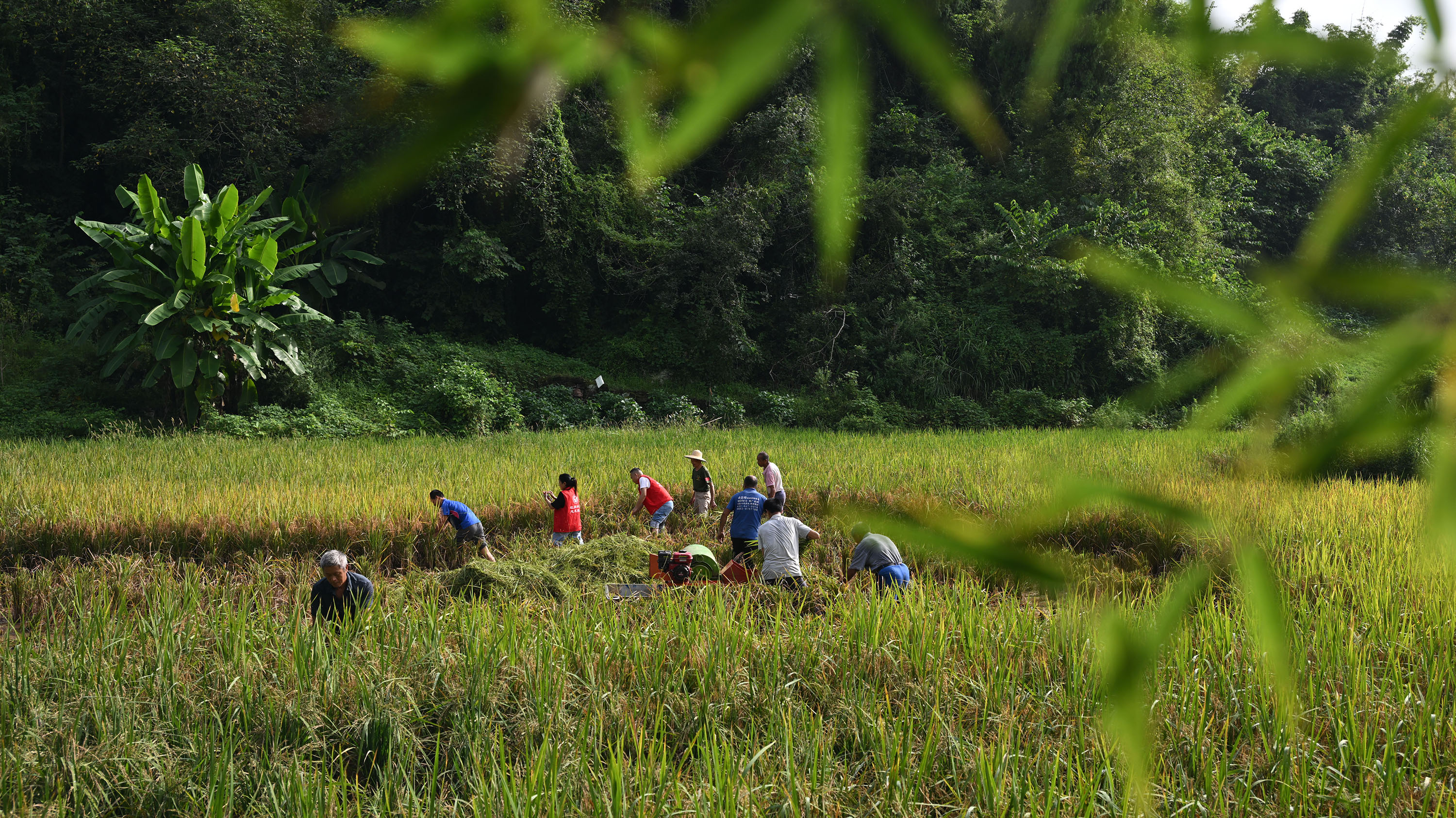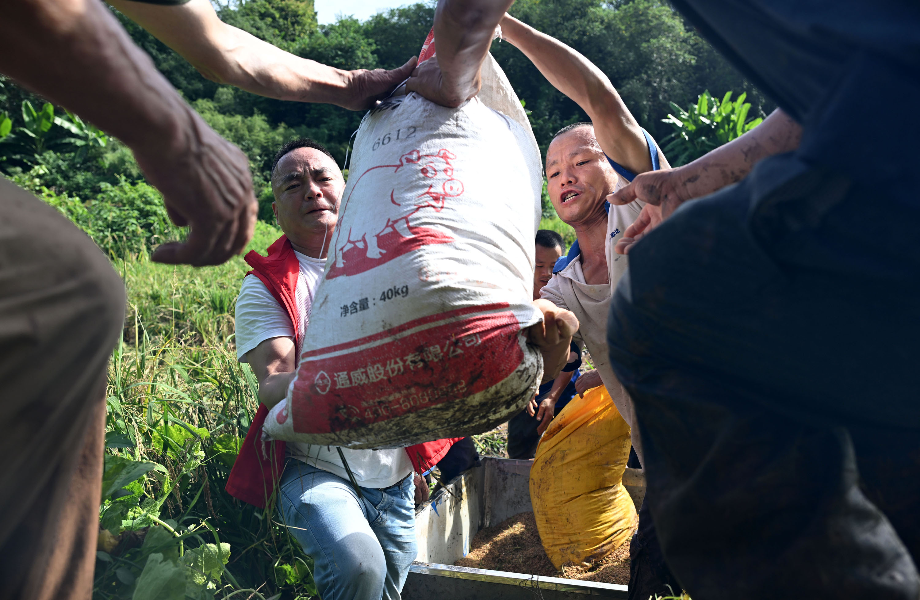 8月11日,内江市东兴区新江街道红旗社区,志愿者为身患重病的当地种粮大户刘祖国挥汗抢收水稻。