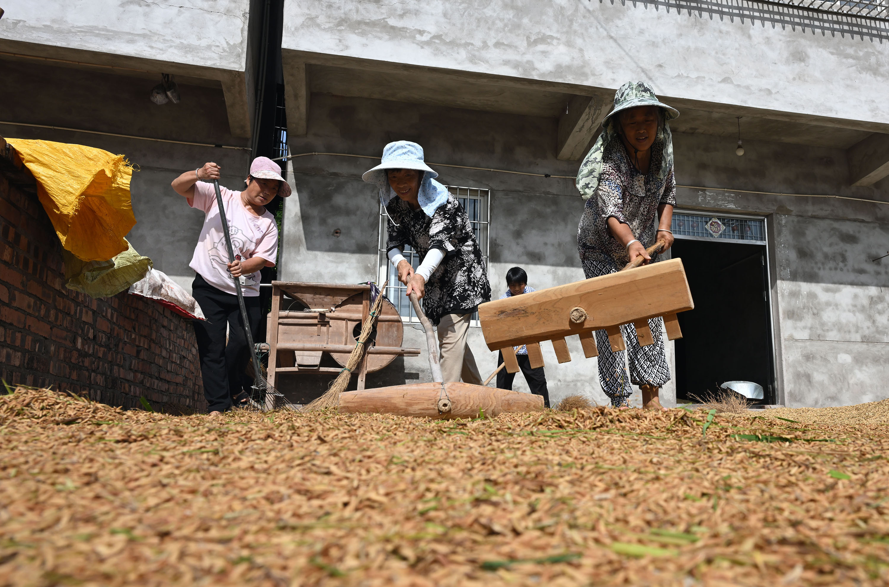 志愿者晾晒水稻