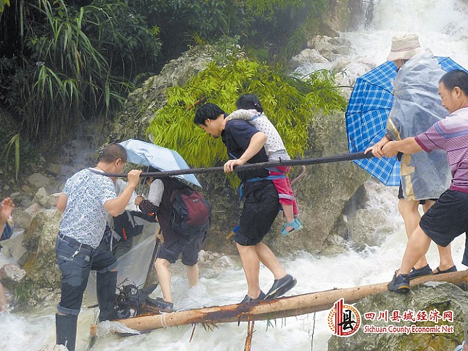 七月八日至十一日,绵阳安县睢水镇遭遇特大暴雨袭击,道喜村山上三十八名群众生命安全受到威胁。村里的党员干部深入灾区,用冲断的树木搭起便桥,将被困群众转移下山。