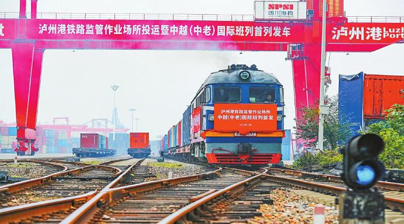 12月18日,泸州市始发的首列中越(中老)国际班列,从泸州港国际集装箱码头驶出。牟科 摄(C视觉)