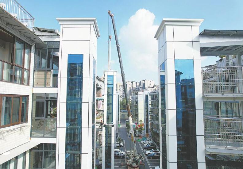 11月22日,在内江市东兴区西林街道锦绣社区,工人正在为老旧小区加装电梯。兰自涛 摄(C视觉)