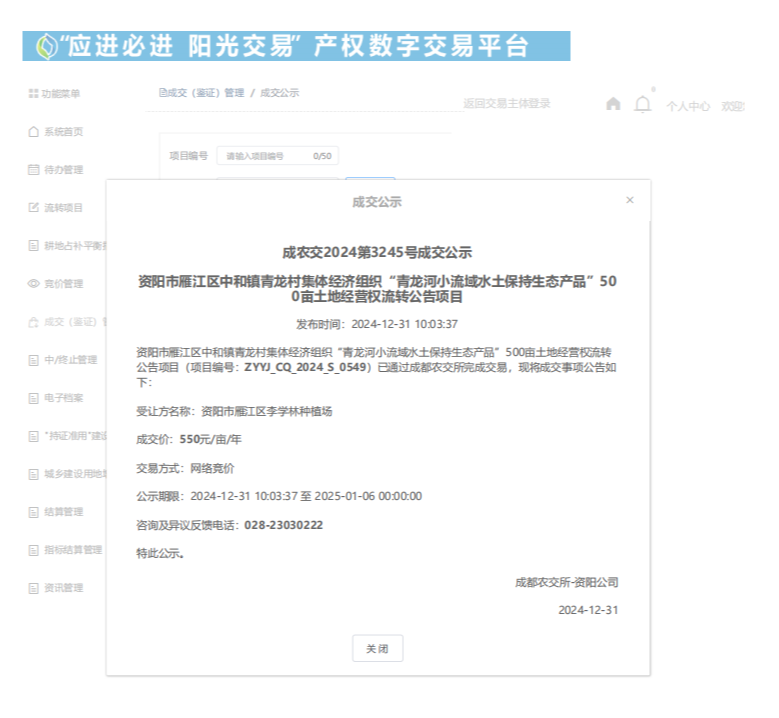 2024年12月31日,四川省资阳市雁江区中和镇青龙村集体经济组织“青龙河小流域水土保持生态产品”500亩土地经营权交易成功,交易金额为81.75万元。
