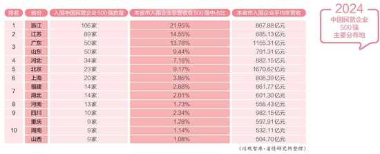 民营企业数量多是一个维度,民营经济的“战力”有多强是另一个维度。梳理全国工商联发布的2024中国民营企业500强榜单发现,浙江上榜企业数量最多,达到106家、占比21.2%,其次是江苏企业89家、占比17.8%,广东、山东均有50家,占比10%。