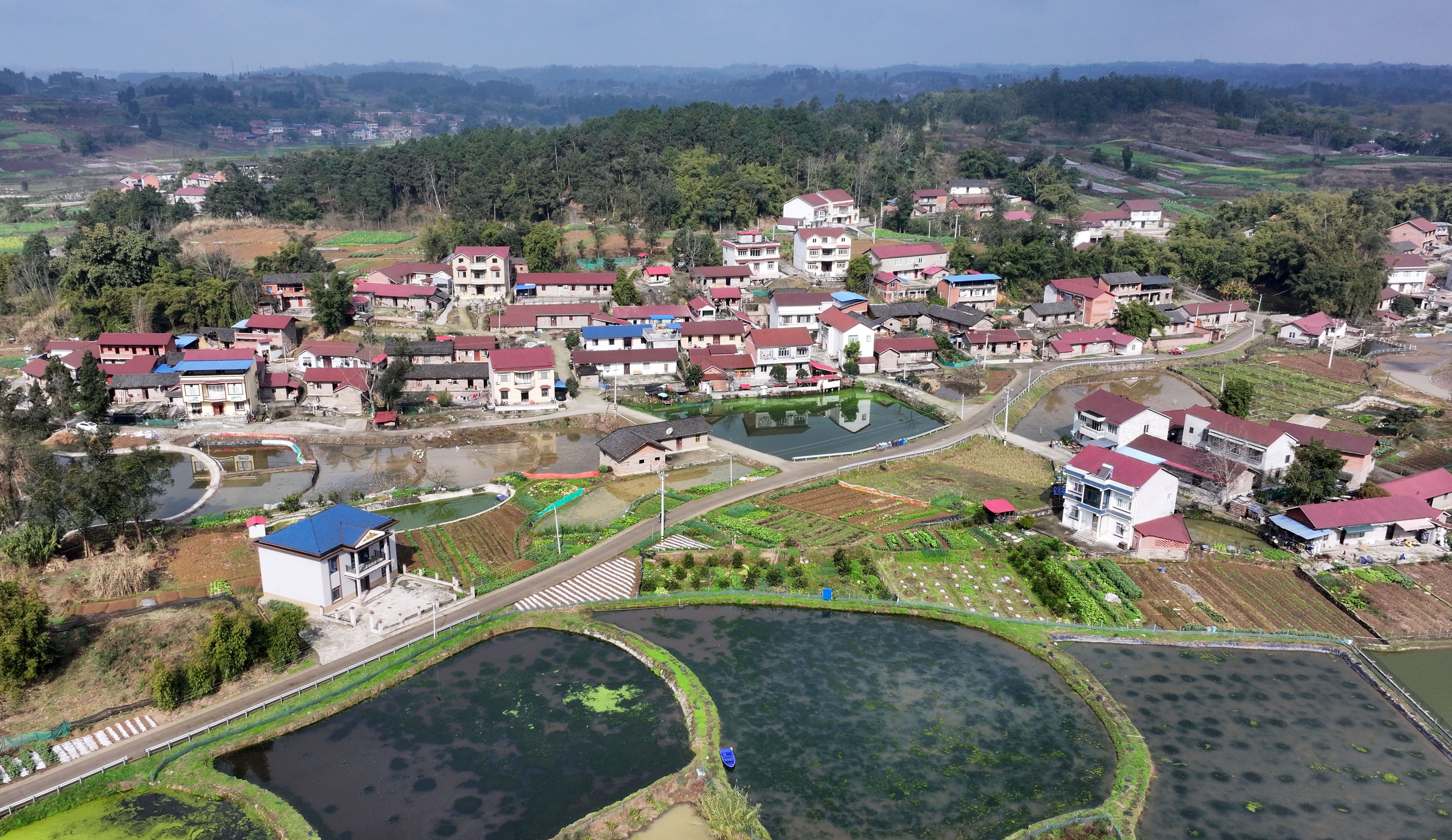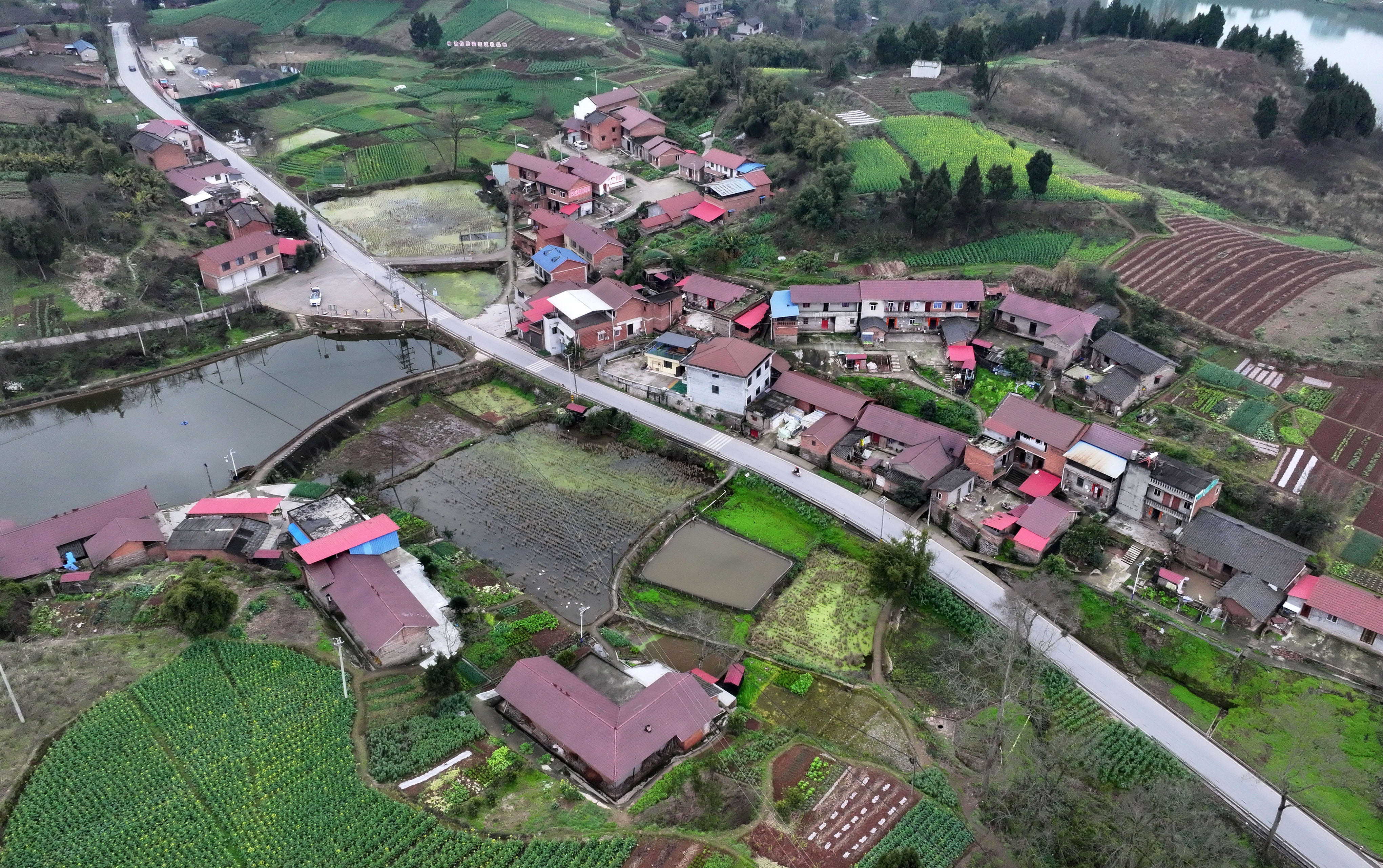 2月25日,内江市东兴区富溪镇田溪口村,当地民居在明媚的春光中凸显勃勃生机(无人机照片)。