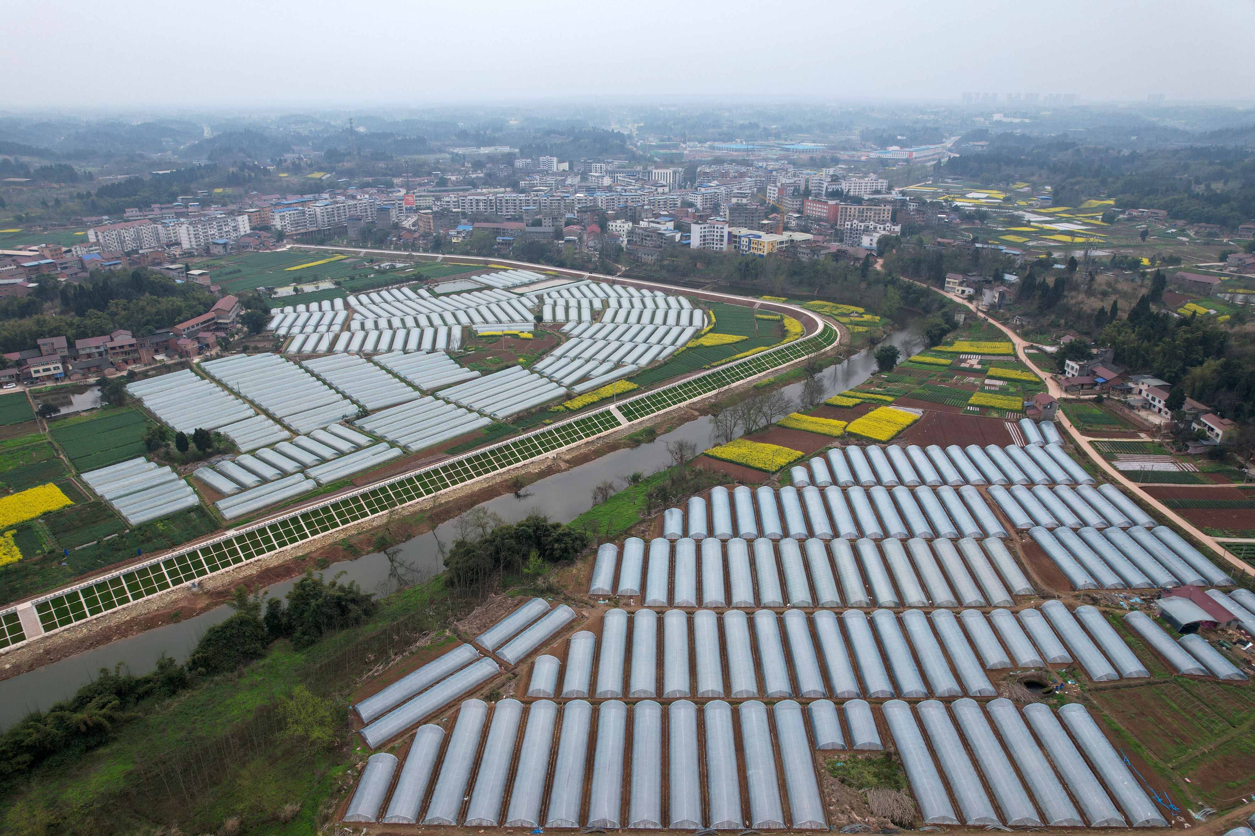 2025年3月11日,在内江市东兴区田家镇,一座座设施农业大棚纵横交错,与田园、公路、村镇等相互映衬,构成一幅美丽乡村新画卷。