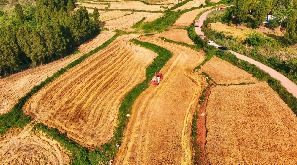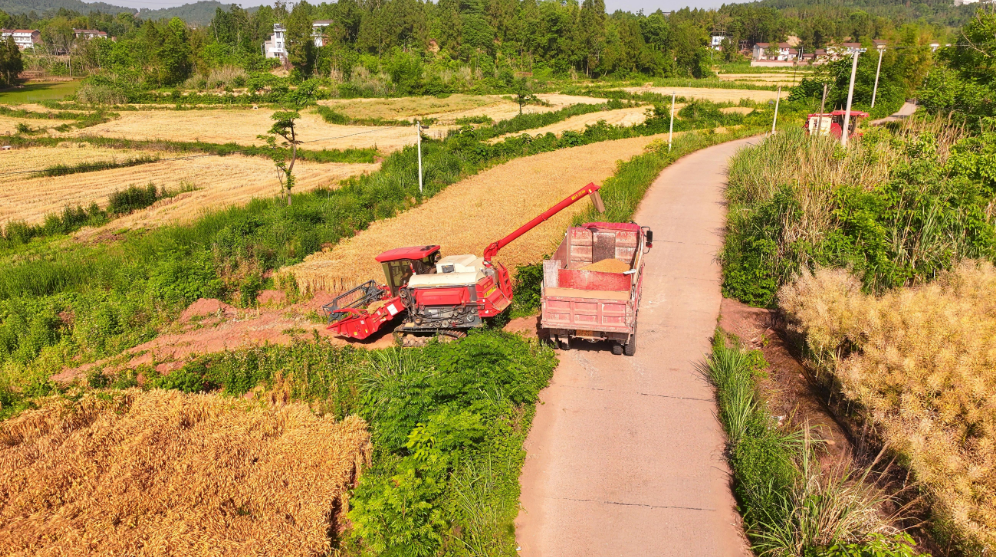 初夏的资阳安岳,田野间麦浪翻滚,机声隆隆,一幅幅生动的丰收画卷正徐徐展开。