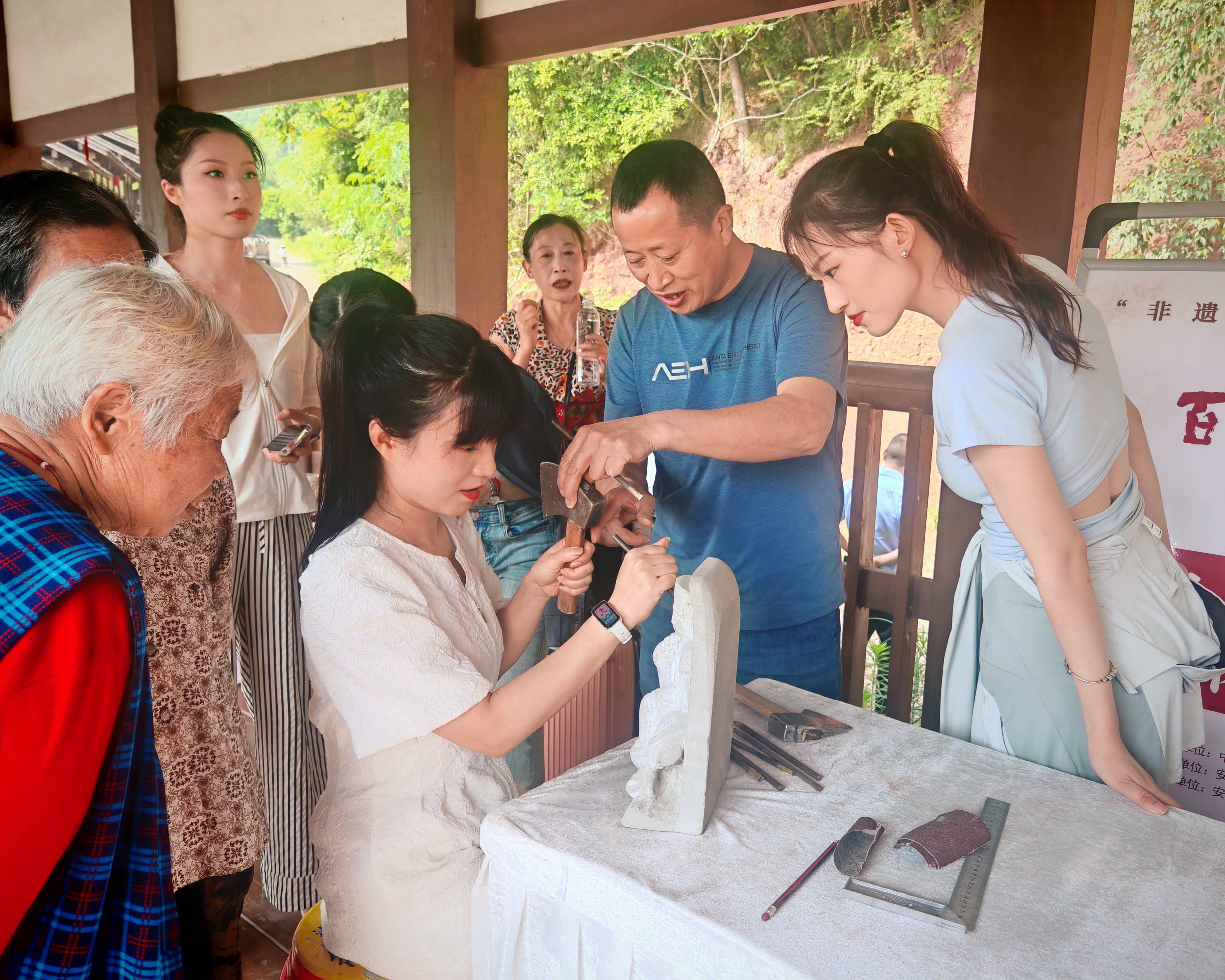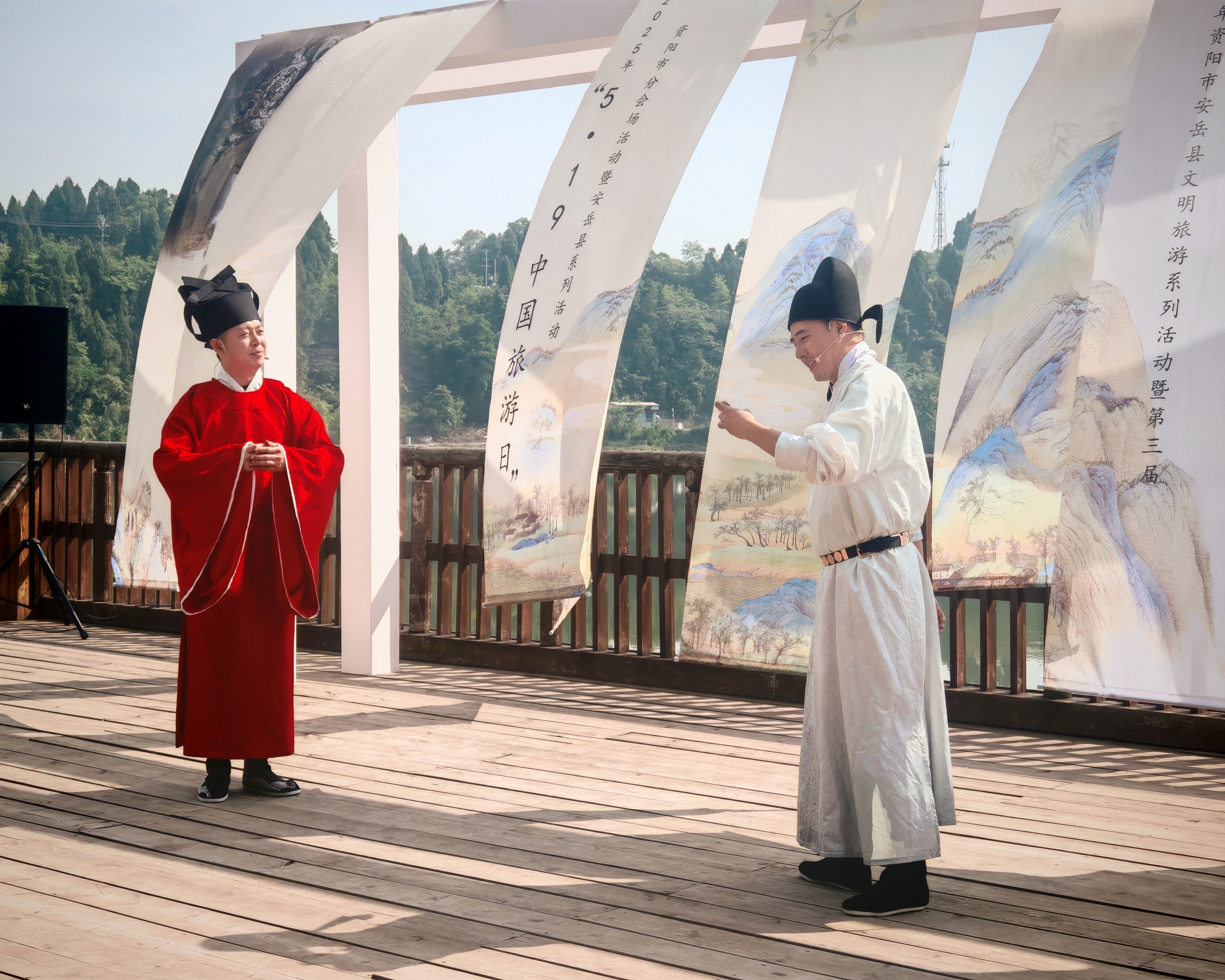 活动现场,安岳曲剧《十八相送》清音绕梁,演员们以细腻的演绎展现传统戏曲的独特韵味。在“诗词飞花令”环节,由演员扮演的唐代“苦吟诗人”贾岛与宋代爱国诗人陆游“穿越”相遇,在长廊旁吟诵经典,引得游客纷纷接句对诗。此外,现场还设置了非遗体验区,安岳竹编、安岳石刻的展示吸引了众多游客驻足观赏体验。