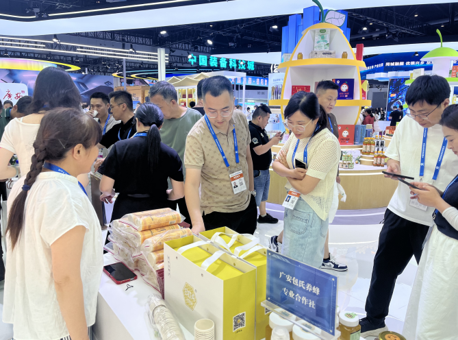 移步农业展区,浓郁的“邻水味道”扑面而来。四川署耕农业开发有限公司的黄精果脯,色泽诱人,入口软糯香甜,黄精的独特药香与果脯的甜蜜完美融合;云天农科的富硒大米,米粒饱满,蒸煮后香气四溢;陈龙手工面业的非遗空心面,细如发丝,久煮不烂,口感筋道;包氏养蜂专业合作社的椴树蜜,质地浓稠,甜润绵长;邻水白茶,汤色清亮,滋味鲜醇;邻水脐橙果酒口感绵柔,回味悠长。这些特色农产品共同勾勒出邻水县现代农业的立体版图,引得客商们纷纷驻足,不时询问品尝。来自广安的退休教师张桂芳穿梭在各个展位间,惊喜不已:“没想到家乡的脐橙能做出这么多深加工产品,带点果酒回去给老姐妹们尝尝。”