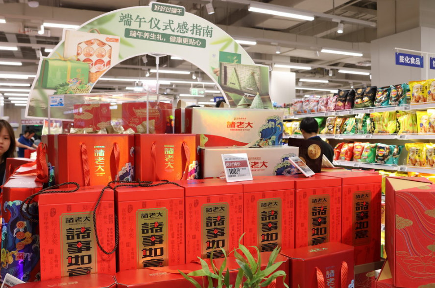 在人来人往的商场,盒马鲜生门店排起了“长龙”,成为市民的热门“打卡地”。从入口到门店内,精美的粽子礼盒被集中摆放在“C位”,米面粮油、肉奶禽蛋、蔬菜水果、烘焙甜点等商品琳琅满目地陈列在货架上,大家推着购物车,认真挑选着商品。