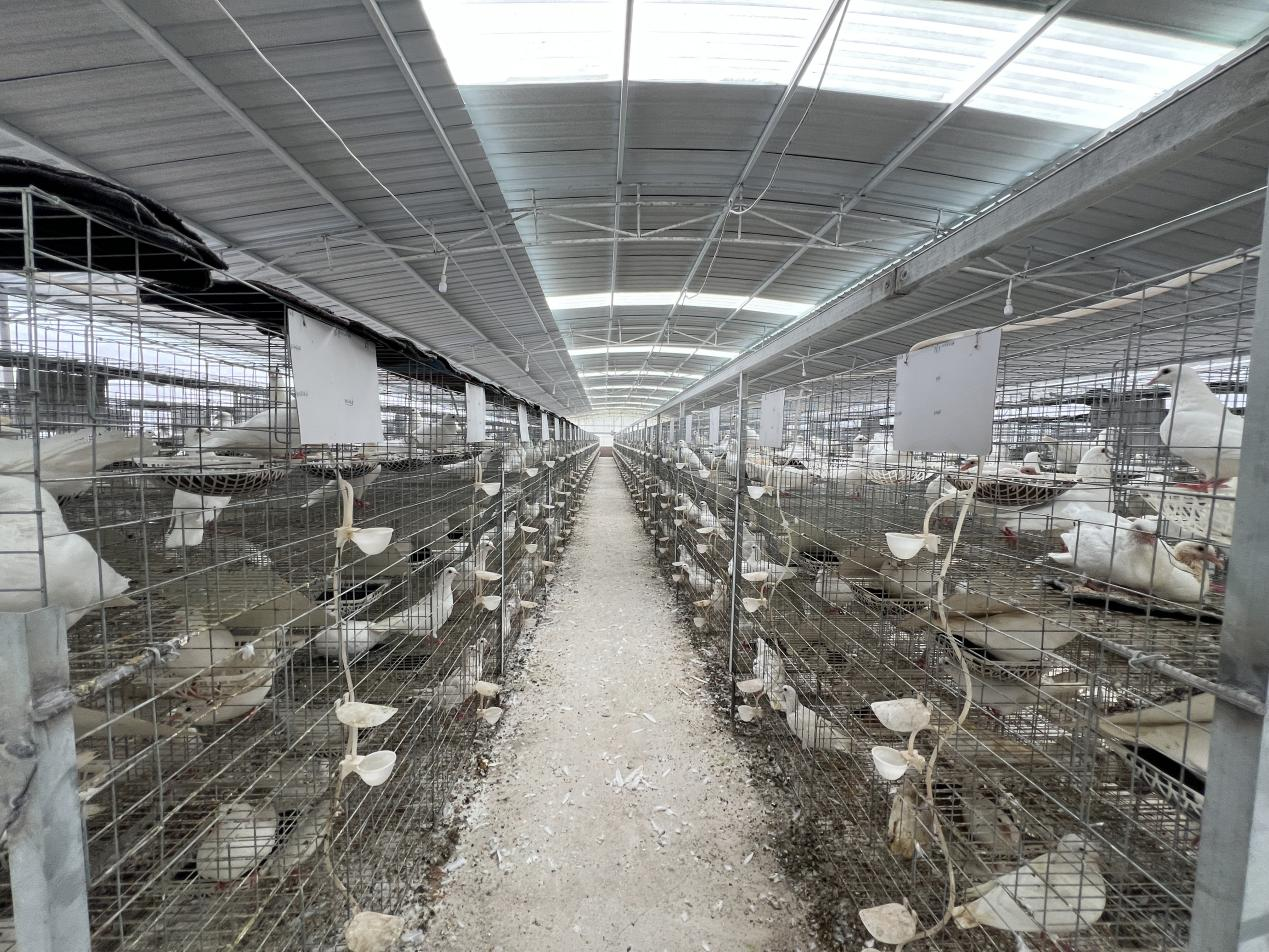 2025年6月6日,记者走进位于资阳市雁江区迎接镇的龙洞湾肉鸽养殖园区,映入眼帘的是数十座现代化鸽棚错落有致地排列着。鸽棚内,一列列鸽笼整齐有序,供水、投料系统完善无缺,一只只鸽子在笼中喝水、觅食,养殖人员穿梭其中,忙碌地准备饲料、收集鸽蛋、打扫鸽舍。