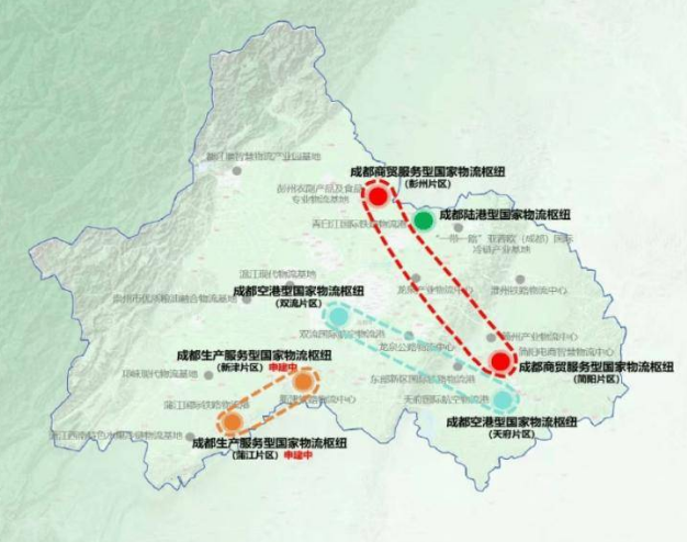 成都商贸服务型国家物流枢纽立足成渝地区双城经济圈核心区位,深度融入国家战略,致力于打造成为西部农副产品保供基地及“一带一路”商贸物流枢纽,临空经济与电商物流示范区、国际空港门户枢纽,区域一体化商贸物流中心及供应链金融创新试验区。重点做强商贸物流集成、干线物流、区域分拨及配送、多式联运转运、现代供应链、电商物流、冷链物流七大基本功能和绿色食品加工、应急储备物流、低空配送、国际物流、综合配套五大延伸功能,形成“7+5”功能体系。