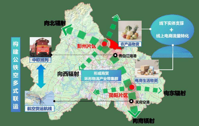 简阳片区主要承载地为简阳临空经济产业园电商智慧物流片区,依托唯品会、传化、中通、申通等物流产业聚集优势,立足简阳作为成渝主轴核心节点的区位与“1空3高5轨6快7站”立体综合交通运输优势,重点发展电商物流、商贸物流、航空物流等产业。首衡集团将在简阳布局西南总部,建设集智慧物流冷链集配、食品采购供应链服务、农产品展销贸易和平急两用城郊大仓基地于一体的立足简阳、服务成渝、辐射西南链接全国、联通全球的国际食品贸易中心。