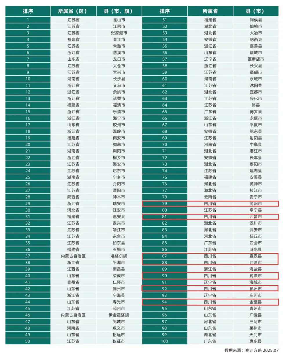 7月23日,赛迪顾问重磅发布《2025中国县域经济高质量发展研究》报告,并揭晓2025全国县域经济百强榜。江苏省昆山市以GDP5380.2亿元雄居榜首,其多年龙头地位无可撼动,江阴市以GDP5126.1亿元紧随其后,不到300亿元的差距让其大有追赶之势。榜单前10强中,江苏的张家港、常熟、太仓、宜兴,福建的晋江、浙江的慈溪、山东的龙口、湖南的长沙8个县市虽相互位次略有交替,但前十位次均十分稳固,让后面追赶者只能望其项背。而四川的简阳市、西昌市、宣汉县、江油市、射洪市、彭州市、金堂县7地已是连续三年跻身百强榜,虽全部位居“70”后且位次变化不大,但西部第一的上榜数量,也算维护了四川作为西部经济大省的尊严。特别是简阳市、西昌市、宣汉县3县市正瞄准千亿目标奋力冲刺,引领四川县域经济强县矩阵梯队加速竞跑,有望在未来百强榜中脱颖而出。