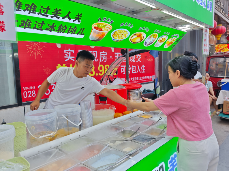 五年前,35岁的李上峰穿梭在钢筋水泥的工地,手里攥着装修的图纸。2020年,人生轨迹悄然变化,从梅西商业广场摆摊起步,到最终选择圣高广场德麦盛外设置的摊区。“每天下午5点,雷打不动地出摊。”李上峰麻利地摆放着配料罐,动作已褪去刚开始的拘谨,多了份摊主的利落与娴熟。“晚上8、9点,就是最忙的时候,生意好的话一晚上能卖出一两百碗。”红糖的醇厚、水果的清爽、糍粑的软糯在一碗碗冰粉中交融,成为消解夏日燥热的良方。而当寒风起,他的小摊便升起暖意,烤冷面热气腾腾,手抓饼金黄酥脆。“这一碗一碗卖出去的,是孩子学费,是一家子的生活费。”从装修工人到糖水摊主,李上峰的转型,是无数普通人创业奋斗的缩影。