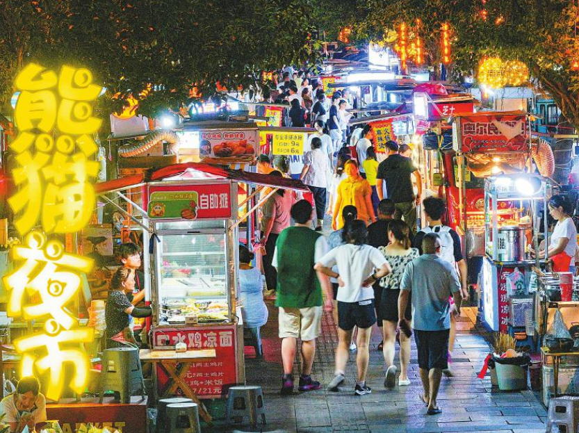 夜色中,熊猫夜市的100余个摊位陆续支起,食物的香味四下弥漫,居民游客陆续到来,或穿梭游走,或驻足光顾。到第二天一早,这段道路又变得宽敞干净,路面几乎看不出昨夜烟火升腾的痕迹。