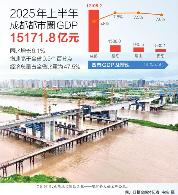 近日,成都市统计局发布数据,上半年,成都都市圈地区生产总值为15171.8亿元,同比增长6.1%,增速高于全省0.5个百分点,经济总量占全省比重为47.5%,成为驱动四川经济高质量发展的核心引擎。