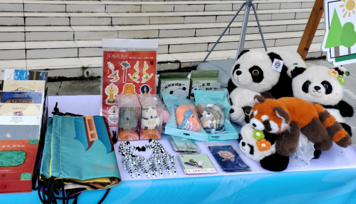 在县城文体中心前,平武设置了8个展位,销售平武绿茶、土蜂蜜、风干鸡等农特产品,平武旅游元素相关的文创产品和新开发的厚朴洗漱用品,吸引了不少游客和客场球迷购买;同时,平武还设置了多块“平武文旅”推介展板,向大家推介平武文旅资源。