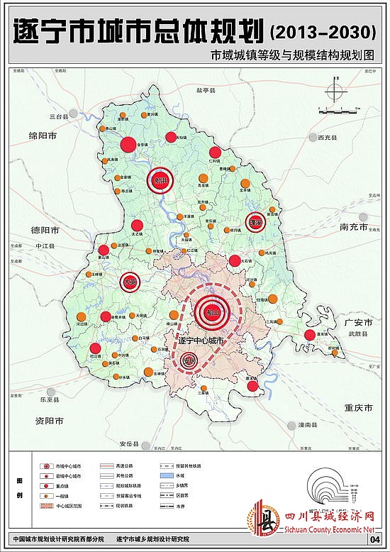 《遂宁市城市总体规划(2013—2030)》在规划市域城镇空间布局时提出,要形成以市域中心城市为核心、县域中心城市为支撑、重点镇为骨干、一般镇为基础的市域四级城镇体系。第一级为市域中心城市,即遂宁市中心城区,规划期末城镇人口为145-160万人。第二级为县域中心城市,即射洪、蓬溪、大英3个县域中心城市。规划期末射洪县城人口规模超过50万人;蓬溪县城和大英县城建设成为中等城市,人口规模为20-30万人。第三级为重点镇,即金华镇、太乙镇等10个,规划期末城镇人口为2-8万人。第四级为一般镇,为剩余的其他镇,共计34个,规划期末镇区人口规模控制在2万人以内。