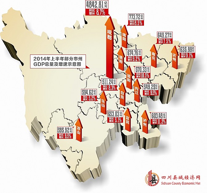 成都首位,依然不可撼动,以4842.81亿元的总量,遥遥领先。在12个市州经济总量中,成都占比41.55%,这一比重与2013年数据比,增长了1.12%。