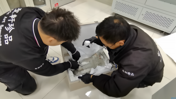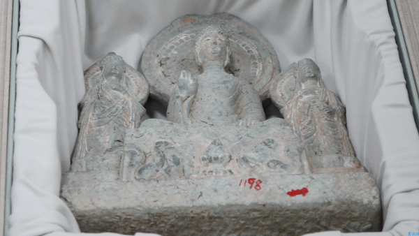 在交接过程中,汶川博物馆工作人员将两件珍贵文物从库房中谨慎取出,与四川省博物院代表共同核对文物信息、检查保存情况,并由搬运人员对文物进行封装,确保运输过程万无一失。据悉,这两件文物分别为南朝彩绘贴金二菩萨石刻造像和唐代彩绘贴金一佛二菩萨石刻造像。两尊石像均采用了贴金工艺,历经千年岁月,依旧保存完好。