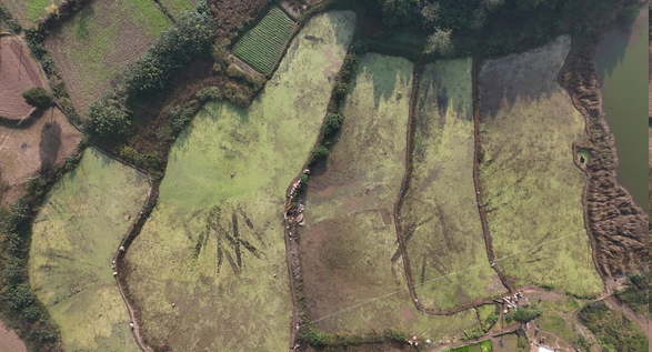 蓬溪县槐花镇五面山村成片的莲藕田。