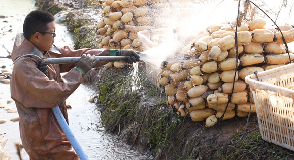 据了解,该基地今年种植莲藕400余亩,得益于雨水充足、光照适宜的自然条件,加之采用科学施肥、病虫害绿色防控等精细化管理技术,莲藕长势格外喜人,亩产量较往年提升10%以上。目前,基地已进入规模化采收阶段,每天平均可采挖莲藕1万余斤,按照当前进度,预计2026年2月可完成全部采收。