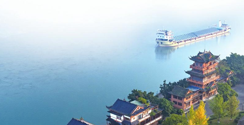 冬日晨雾中,一艘货轮停泊在宜宾李庄古镇奎星阁外的江面上。张华 摄(C视觉)