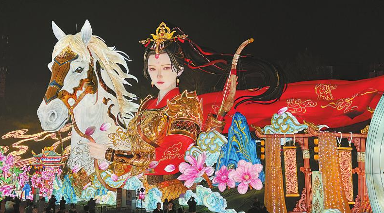 今年,英姿飒爽的花木兰策马而来,场景化讲述《木兰辞》的波澜壮阔。为呼应农历马年,灯会特别打造了180米长的“木兰传奇”灯组。该灯组首创“彩灯连环画”叙事形式,将《木兰辞》全文场景化、连续化呈现,游客漫步其中,如同穿越至木兰替父从军、驰骋沙场的壮阔画卷。“我们用了近8万米丝架和超过20万件彩灯部件,才实现这种连贯的沉浸感。”现场制作负责人说。