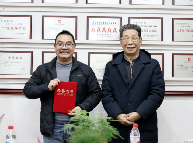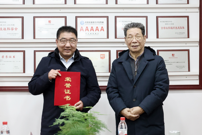 学会名誉会长、原省劳动和社会保障厅厅长张成明为2025年度学会先进员工颁发荣誉证书