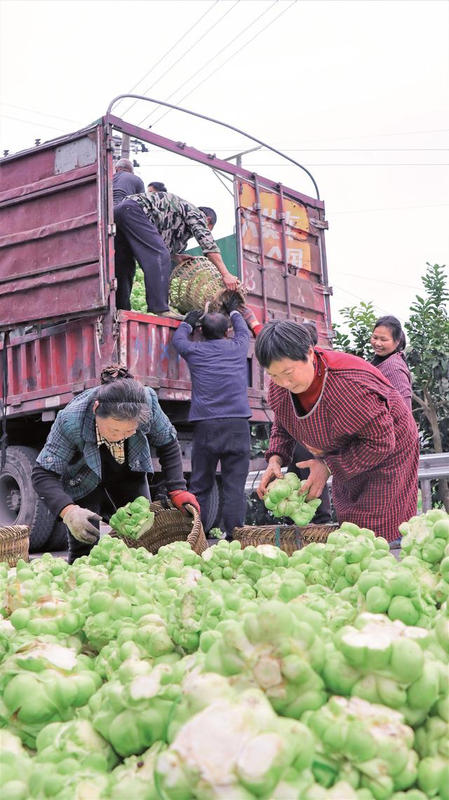 在虎城镇紫龙村的花椒种植基地里,300亩花椒树下间种的榨菜迎来丰收,村民分散在田间,忙着削根、去叶、转运、装车,动作娴熟利落。