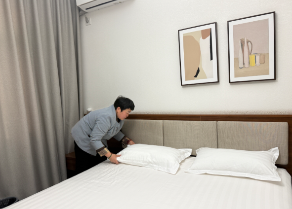 随着赏花客流持续攀升,园区民宿迎来预订高峰,成为游客留住春日美好、深度体验乡村生活的首选。在民宿区,保洁人员正对刚退房的客房进行全面打扫,全力保障游客居住环境干净舒适。据了解,今年1月以来,园区民宿接待量稳步提升,2月整体入住率达95%以上,客源主要来自遂宁市区及周边城市,乡村旅居热度持续升温。