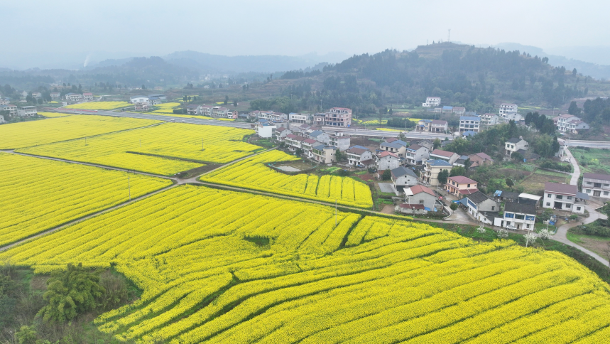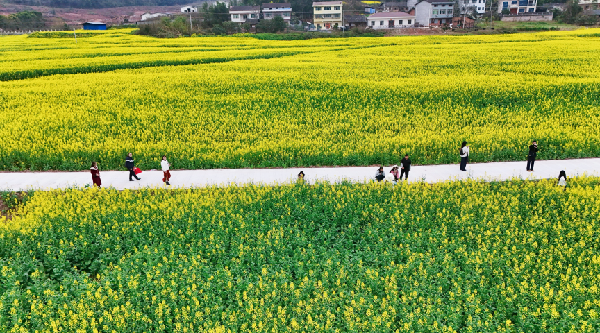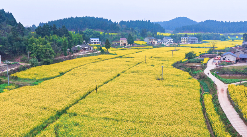春风送暖,沃野鎏金。步入三月,资阳市安岳县51.43万亩油菜花次第盛放,连片金黄铺满丘陵田间,与错落村舍、蜿蜒道路相映成趣,勾勒出一幅生机盎然的春日田园画卷。这片金色浪潮不仅带来了视觉的盛宴,更涌动着产业增效、乡村焕新的蓬勃活力。