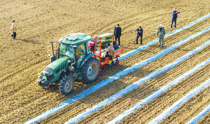 村民利用机器对玉米进行覆膜移栽。 何雨隆 摄