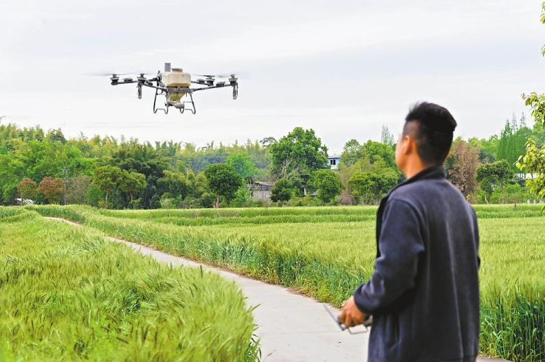 自勤农机专业合作社理事长苏烈使用无人机施肥。 四川日报全媒体记者 黄潇 摄
