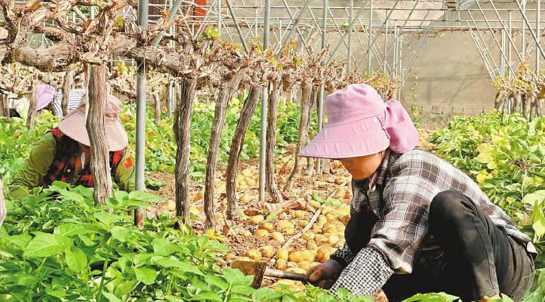 3月16日上午,西昌市安宁镇源兴村,阳光透过刚开始萌芽的葡萄枝,洒在一排排刚收获的马铃薯上。村民徐国艳蹲在地头,随手捡起一个拳头大小的马铃薯:“这是川凉芋19,你看这品相,按现在的价格,这个大棚至少能多收8000元。”徐国艳算了笔账:葡萄每年10月采摘完,到次年3月才开始萌芽,中间空出4个月。去年11月,趁着这个空当,套种了凉山州农科院选育的新品种“川凉芋19”。