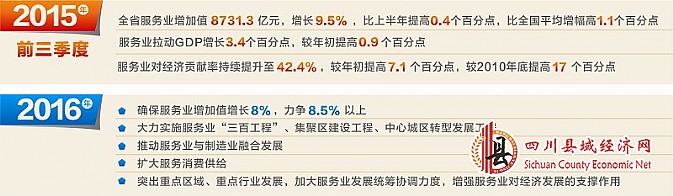 这项政策背后是我省服务业多点多极支撑发展的谋篇布局。谢开华介绍,2016年我省将优化服务业多点多极支撑格局,推动各市(州)实现服务业功能分区,加快发展特色服务业。具体来说,就是加快推进成都服务业核心城市建设,推进天府新区打造服务业新增长极;推动泸州、绵阳、乐山、南充、达州、凉山6个市(州)建设区域性服务业中心城市。