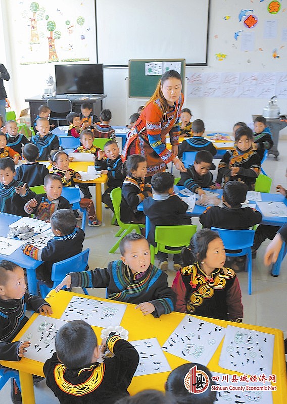 昭觉县洛切吾村幼教点的老师正在教小朋友们画画