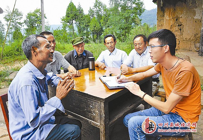 南江县赤溪乡蒲坪村“第一书记”陈鑫(右一)和村干部征求村民对精准扶贫工作的意见和建议。