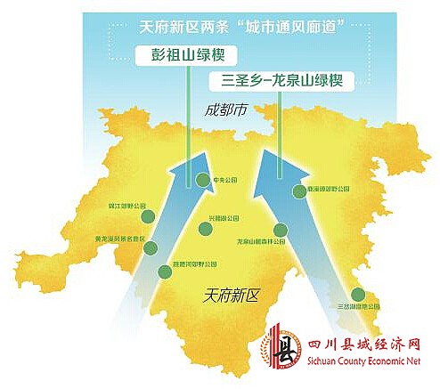 据了解,经过多年的气象数据统计,成都的主导风向大体为南北向(包括西北至东南向,以及东北至西南向),为此在编制天府新区总体规划时,专家分别规划了“三圣乡-龙泉山绿楔”和“彭祖山绿楔”,均位于成都的上风上水处。