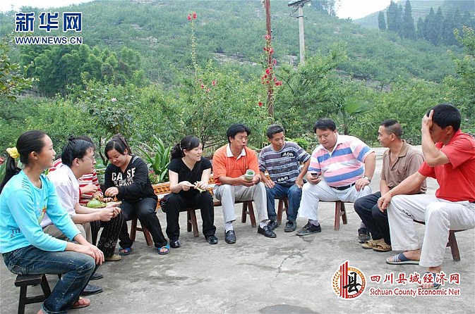 王家元(右一)在和村民讨论李子种植的管理问题(2009年6月12日摄)。新华社发