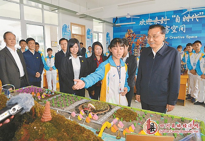 4月24日,李克强总理来到芦山县第二初级中学考察学校重建情况,在学校“创客空间”兴致勃勃参观孩子们的创意作品。