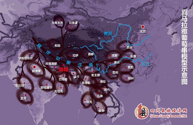 图2环珠峰经济圈“葡萄串”模型(喜马拉雅是主杆,环10国及其大小城市是“葡萄”)