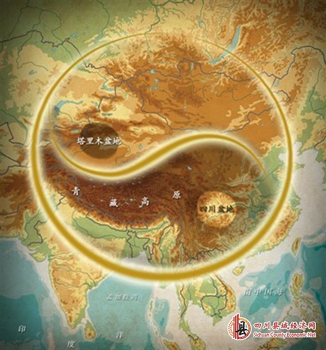 图3青藏高原天然“太极图”(四川盆地与塔里木盆地是对称点)