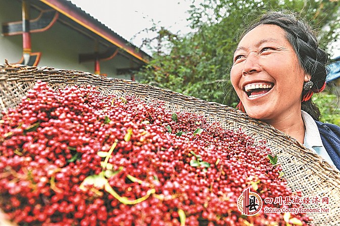 “精准套餐”扶贫见效。8月8日,美姑县农作乡正在采摘“大红袍”花椒的村民吉克笑得合不拢嘴。记者 吴传明 摄