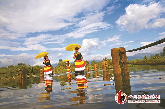 漂亮的彝家姑娘与西昌湿地美景。记者 王云 摄