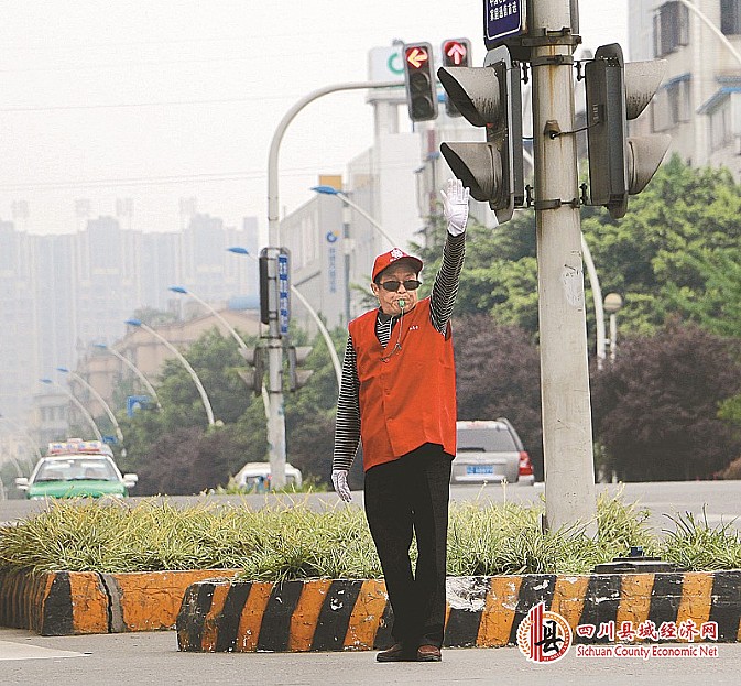 文明交通劝导员在路口开展文明劝导