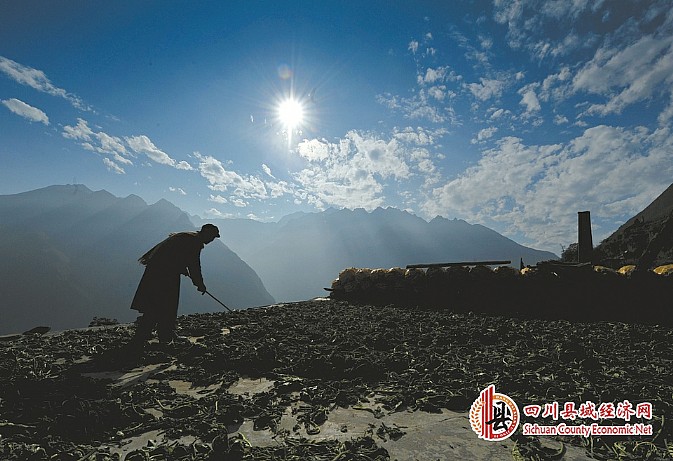 深秋的阳光下,68岁的杨庆平在屋顶上晾晒着烟叶,远处矗立着地震中唯一保存完好的碉楼。