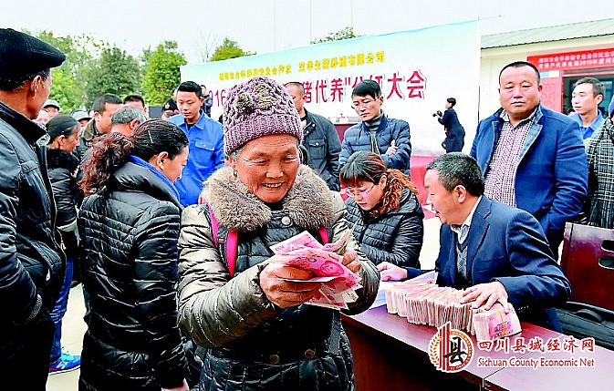 12月15日,绵阳市安州区睢水镇金华养猪专业合作社2016年度贫困户“母猪代养”分红大会上,来自村、社的贫困户领到年终分红1300多元。当天,来自安州区和北川县33个贫困村的200户建卡贫困户共收到合作社发出的26万元分红“大红包”。金华养猪专业合作社在自身发展的同时,探索实施“5432添、送、输”的精准扶贫模式,增强“造血”功能。当年共计为3384户农户实现节支增收157万元。蒲滔 摄(视觉四川)