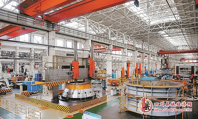 德阳东方电机数控大型厂房内,技术工人在生产线上生产。
